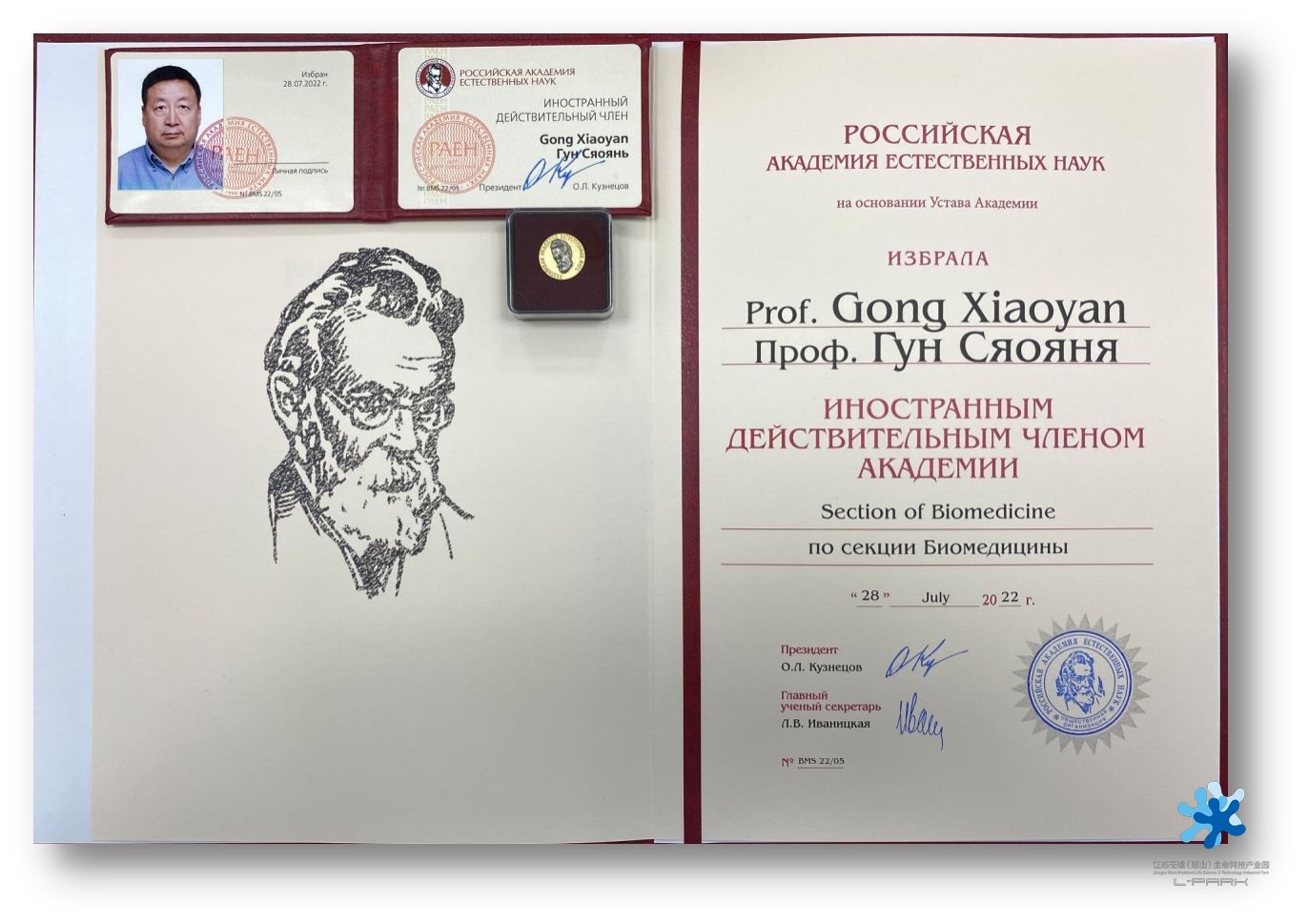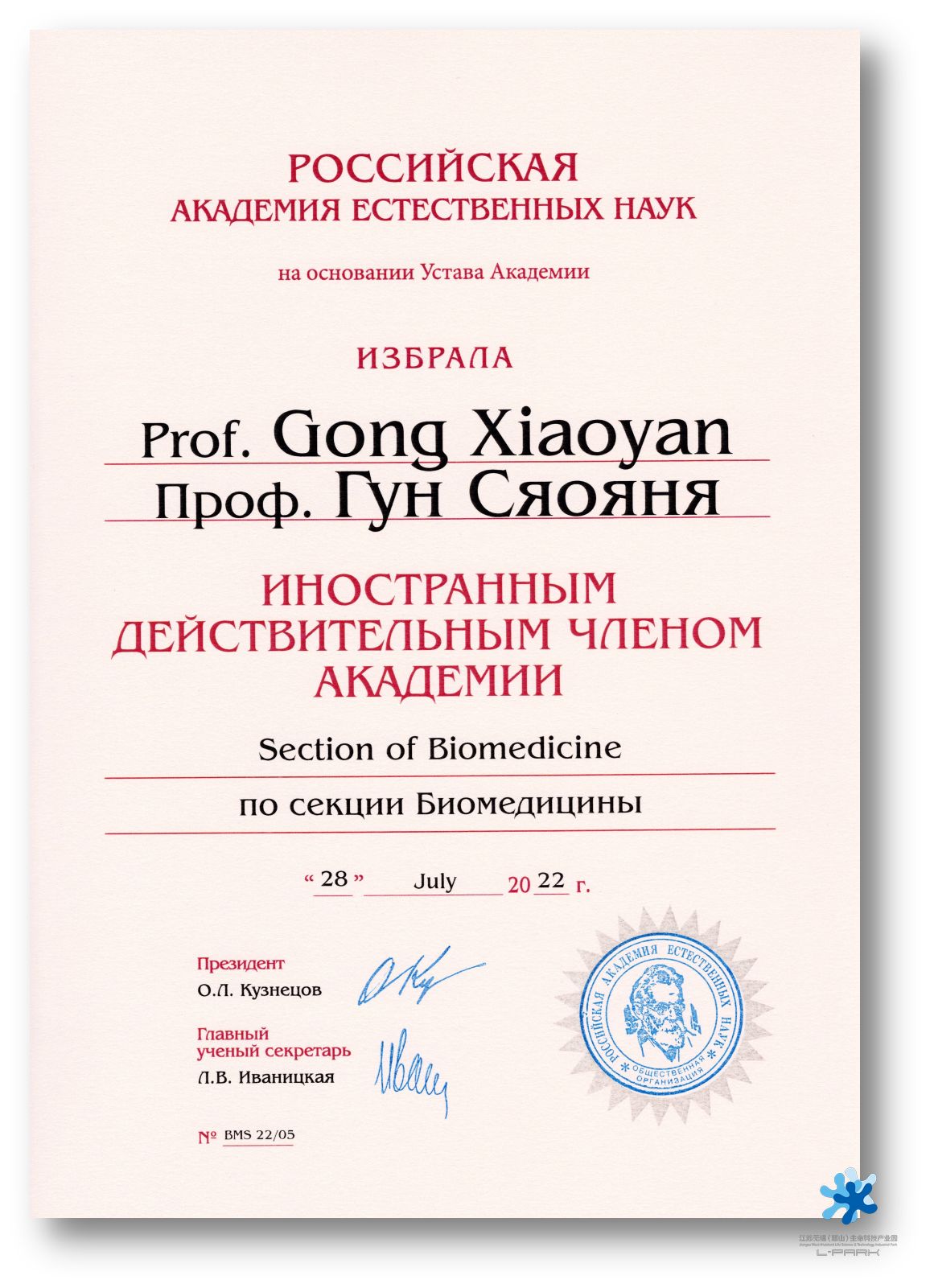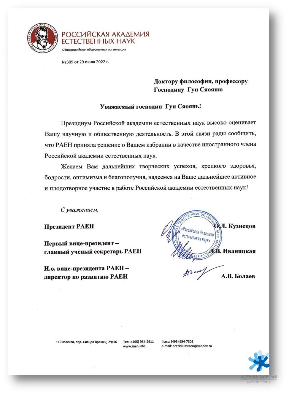 近日,茵絡醫(yī)療創(chuàng)始人龔霄雁博士收到俄羅斯自然科學院(PAEH/RANS:Russian Academy of Natural Sciences)院長O. L. Kuznetsov 院士的來信,祝賀他當選為俄羅斯自然科學院外籍院士。來信高度評價了他在科學和公共活動方面為世界做出的貢獻,并簽發(fā)了院士當選證書與院士工作證。